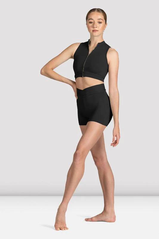 Our Ladies Mirella Miami V Front Short features a high waist with a V front wrap over waistline and intricately braided trim detail. Pair with our Camisole Crop Top or Zip Front Crop Top for your perfect dance ensemble. Part of our Mirella Miami Collection; showcasing intricately braided trims, elegant mesh panels, and golden hardware. The collection boasts a striking palette, injecting South Beach glamour into your dance attire.