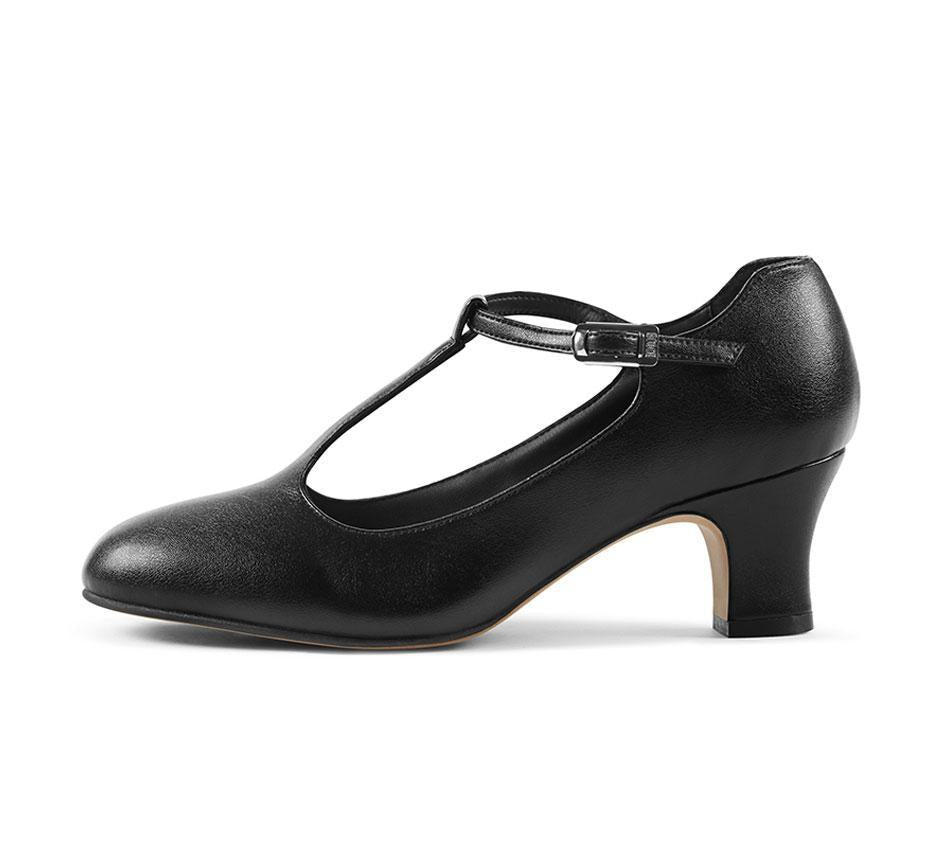 A leather T-bar chorus shoe with a 2 inch heel and a full leather sole for durability and comfort.