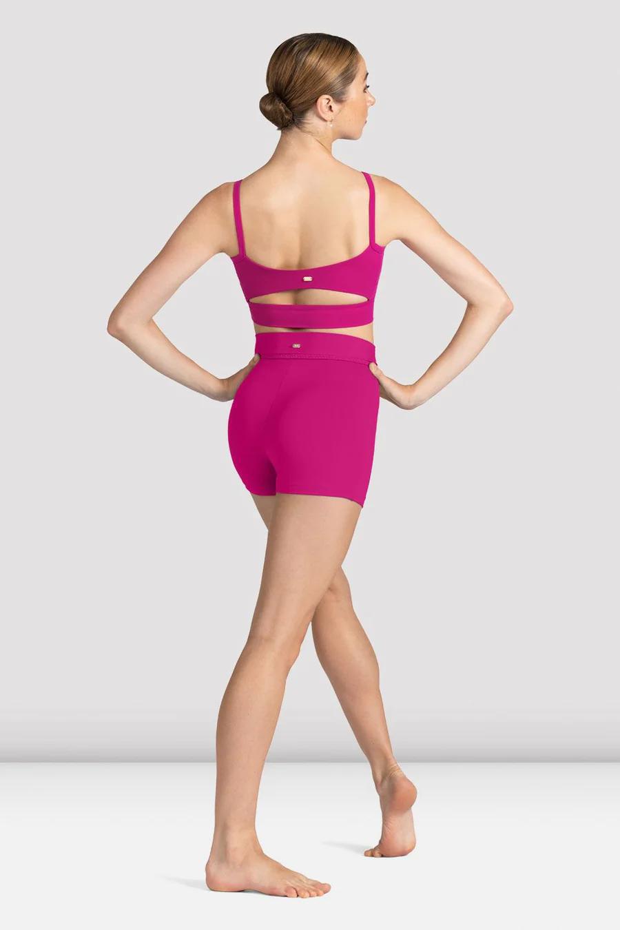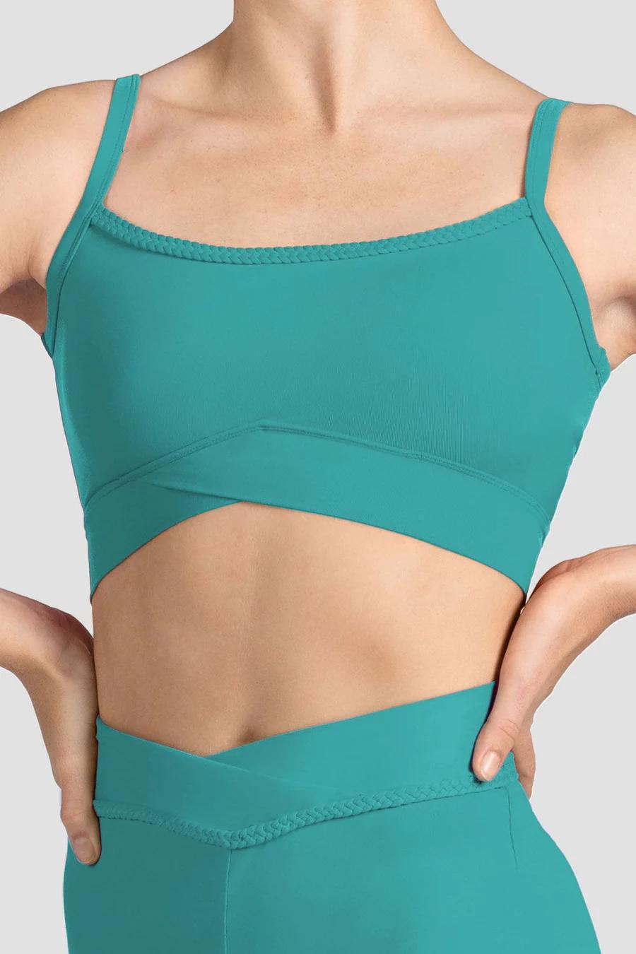 Our Ladies Mirella Miami Camisole Crop Crop Top features a cropped length with a soft wrap over underbust band, intricately braided trim detail and cutout back detail. Pair with our V Front Short or V Front Jazz Pant for your perfect dance ensemble. Part of our Mirella Miami Collection; showcasing intricately braided trims, elegant mesh panels, and golden hardware. The collection boasts a striking palette, injecting South Beach glamour into your dance attire.
