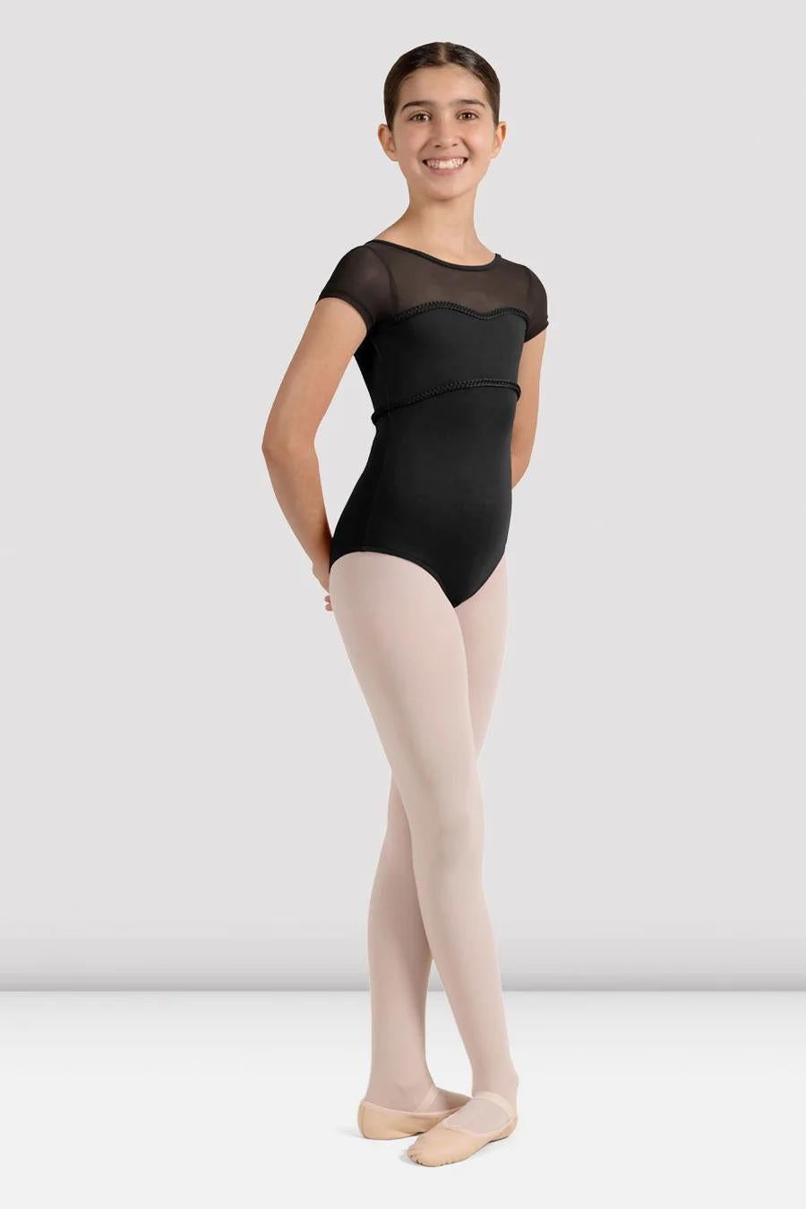 Our Girls Mirella Miami Cap Sleeve Leotard features soft mesh panels across the neck and back with a double scoop mesh back and intricately braided trim around the bust. Part of our Mirella Miami Collection; this collection of super-cute dancewear features braided trims, eye-catching shades, and shiny gold details for a touch of show-stopping sparkle.