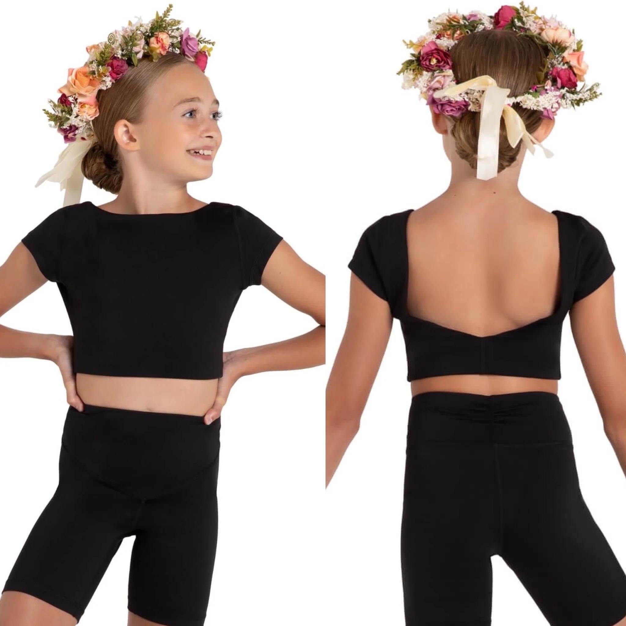 Add a little luck to your wardrobe with the Clover Crop Top! This crop top features a boat neckline that adds a touch of sophistication to the piece, making it versatile enough to wear from studio to street. The built-in shelf bra on the front and back of the top provides ample support and ensures a secure fit, making it perfect for dance, exercise, or even a night out. The rounded V back neckline adds an elegant touch to the design while also allowing for a greater range of motion. The fully front lined construction ensures the top is not see-through, ensuring modesty and comfort. Pair with the Buttercup Bike Shorts or the Blossom Legging to complete the look. Available in both adult and child sizes.