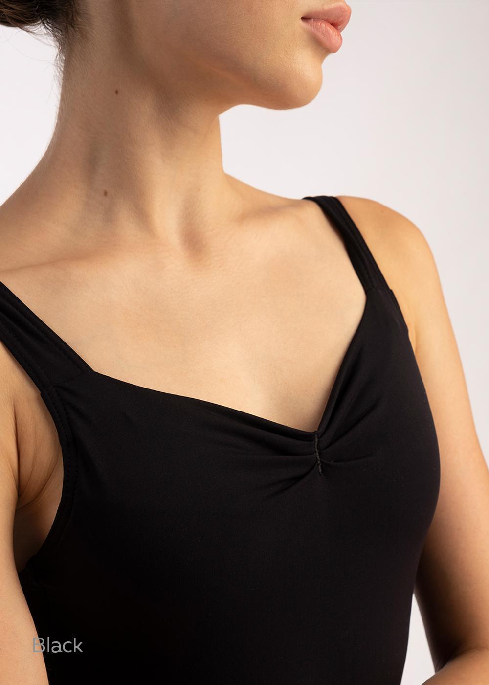 Tank style cut leotard featuring full front lining and open U mid-back. Secure and comfortable straps. Fixed bust pinch. Adjustable leg line.